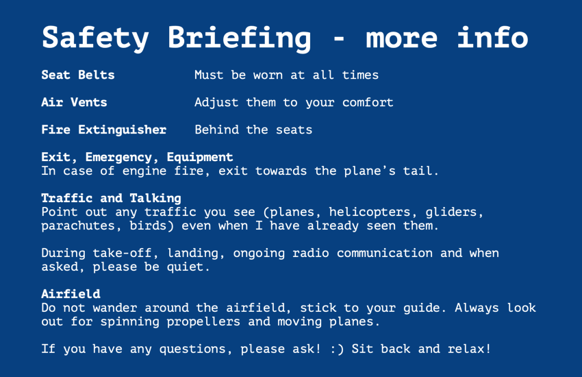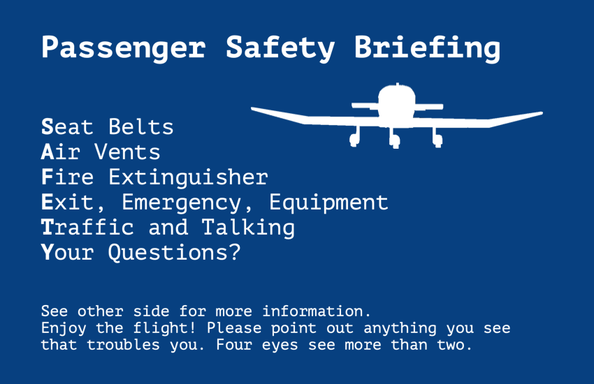 Hence, I decided to use these cards as a way for myself to structure my safety briefing. Additionally, I figured these little cards (the size of a business card) would also be a nice keepsake for whoever is flying with me.